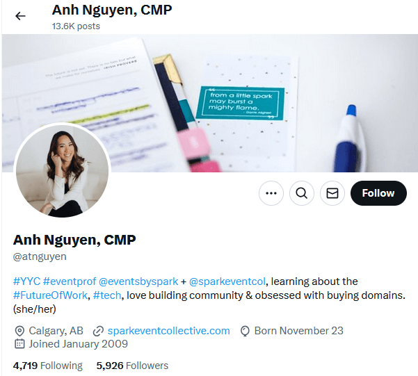 She joined Twitter in March 2009, and since then she has posted over 5,500 tweets. She posts mostly about events, travel, and her work.