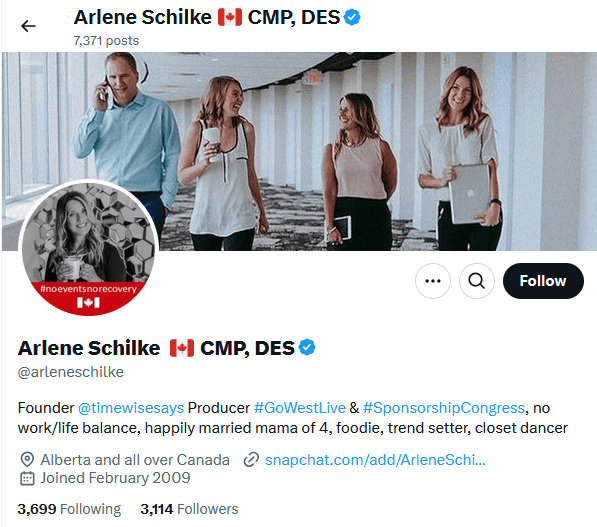 Founder of Timewise Event Management Inc., Immediate Past President MPI Edmonton Chapter, Executive Producer GO WEST LIVE, Western Sponsorship Congress, Edmonton/Calgary Event Awards. She is passionate about connecting and collaborating with people in the Events Industry.