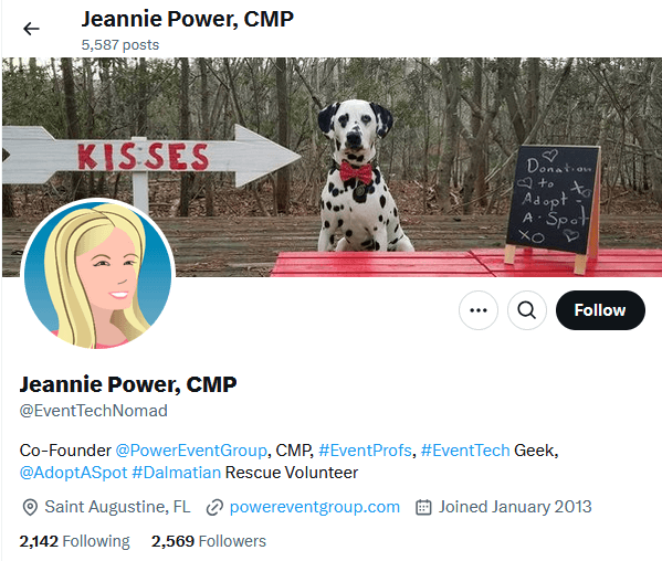 She started her first company, Event Elements, in upstate New York in 2004. Since then, she has expanded and rebranded the company into Power Event Group, offering event solutions across the event planning process. She joined Twitter in January 2013.