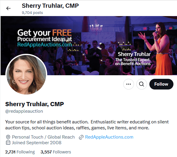 Sherry is a virtual gala and fundraising auctioneer offering practical training for Auction Chairs of nonprofits and schools. She is from Virginia, USA.