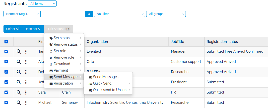 To send messages to registrants, navigate to the registrant's view by clicking on "Registrants" in the Registration section toolbar. Select the registrants who should receive the message, or click "Select All" to include everyone in the active report. After selecting the recipients, click on "Bulk Actions" and then "Quick Send." Choose the message template you want to send. You can also choose to send the message only to those who haven't received it yet.